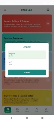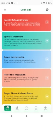 Elu väljakutsed – olgu need perevaidlused, abieluprobleemid, karjääridilemmad või emotsionaalne stress – nõuavad tarka juhendamist. Meie nõustajad pakuvad konfidentsiaalset abi, et aidata sul navigeerida elu keerdkäikudes selguse ja rahuga. Lisaks sellele pakub Deen Call olulisi igapäevaseid vahendeid, nagu täpsed palveajad ja Qibla suund, Koraani täistekst koos tõlgetega, autentsed Hadithi kogumikud, *Masnoon Duad* ja igapäevased palved ning nii Hijri kui ka Gregoriuse kalender. Rakendus toetab mitut keelt, pakub kasutajasõbralikku disaini ja tagab sinu privaatsuse kõikide konsultatsioonide puhul, saades regulaarseid uuendusi uute funktsioonide ja parendustega. Deen Call on sinu kaaslane teel vaimse selguse, tervenduse ja kasvu poole.
